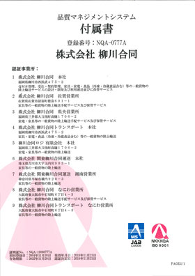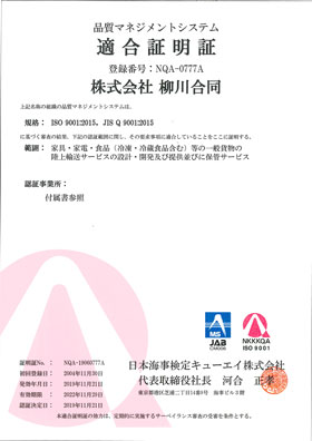 認証規格 ISO 9001:2015, JIS Q 9001:2015 認証機関 日本検査キューエイ株式会社 登録番号 NQA-0777A 認証範囲 家具・食品(冷凍・冷蔵食品含む)等の一般貨物の陸上輸送サービスの設計・開発及び提供並びに保管サービス 認証事業所 【株式会社柳川合同】